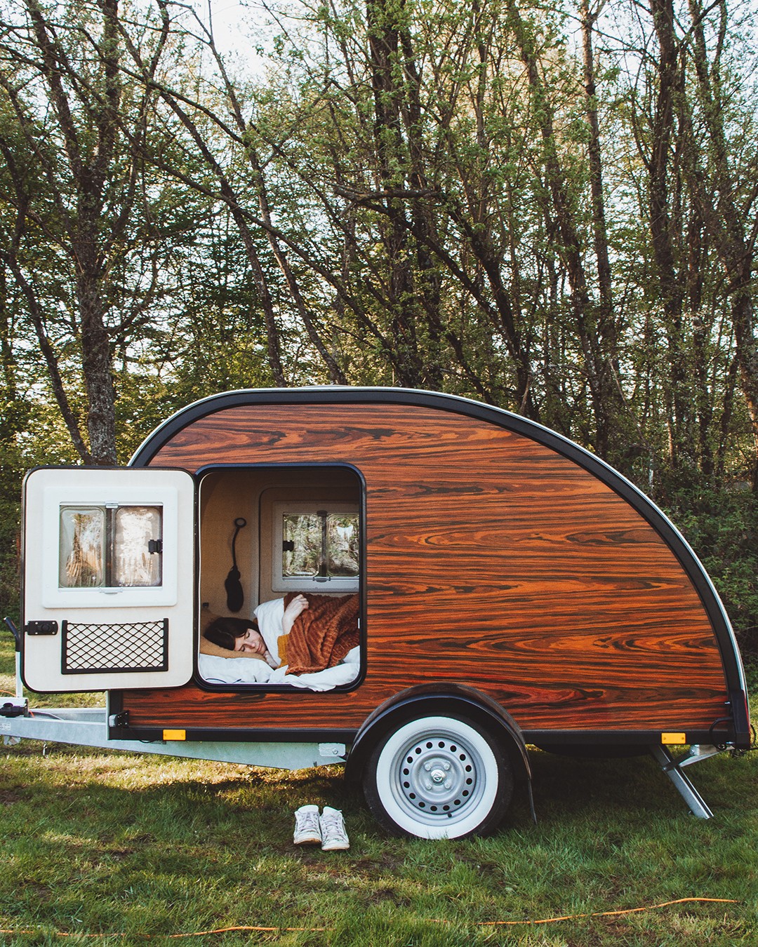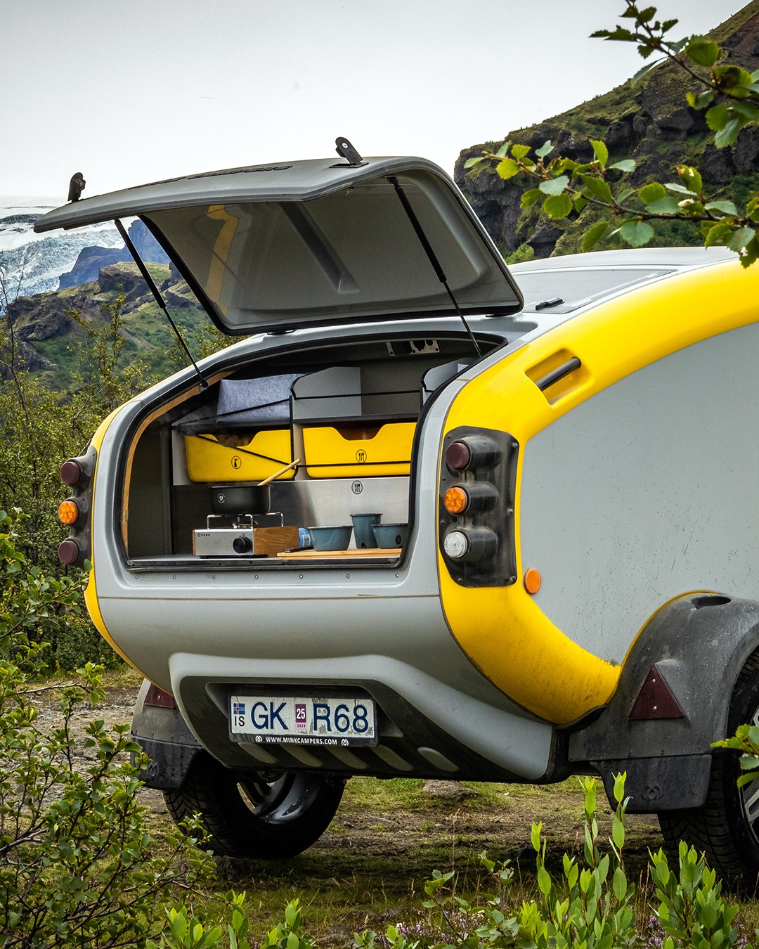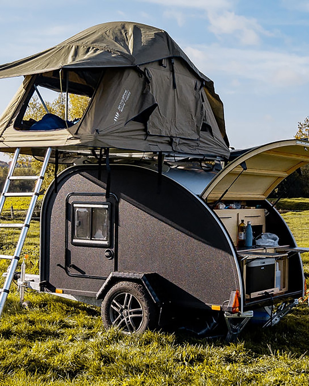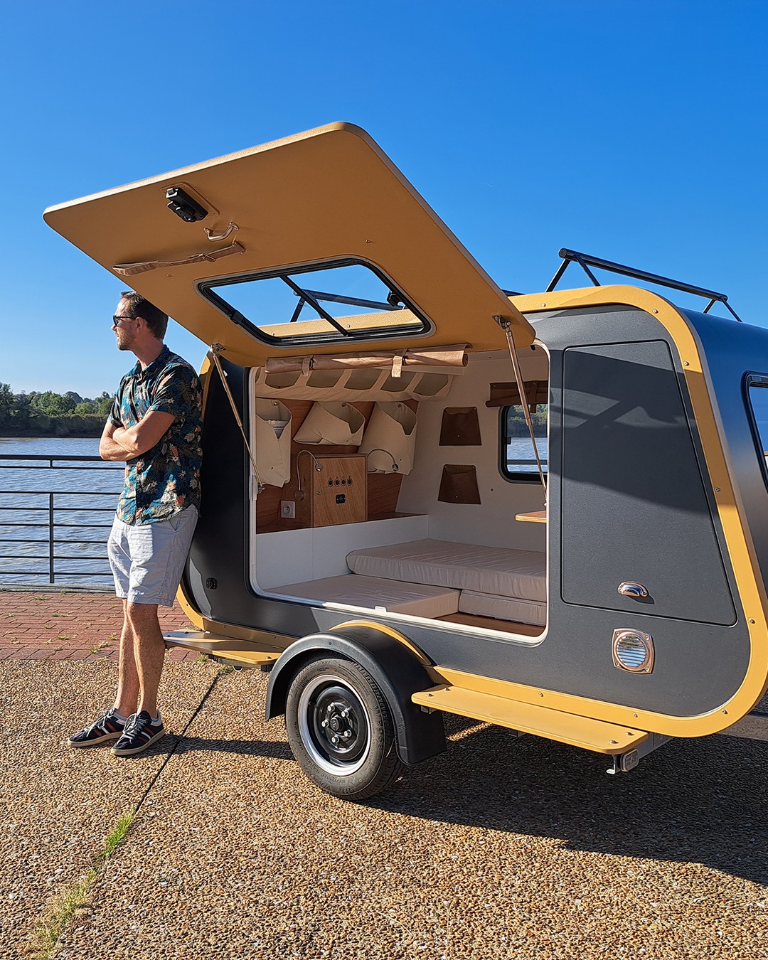 De Carapate minicaravan is een atypische teardrop die buiten naar binnen haalt.